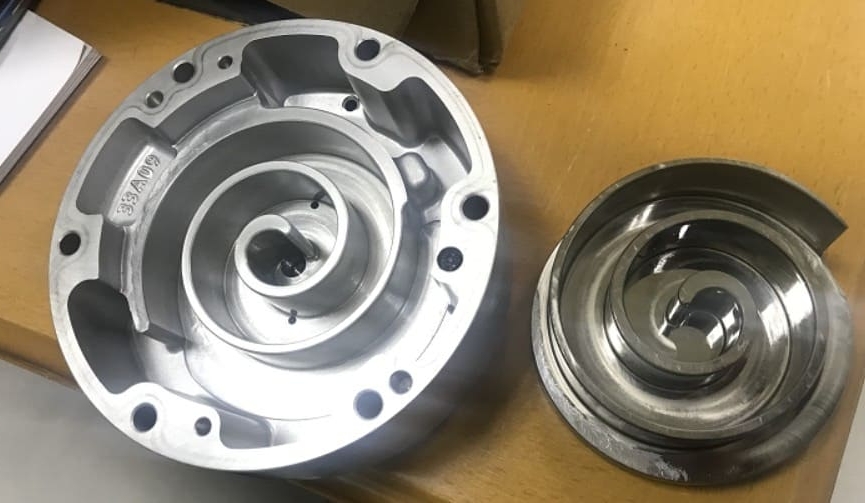 Fabrication process starts with precision casting to create the spiral body of the scroll. Choice between ductile iron and aluminum‐silicon alloys depends on targeted application. Casting produces a near‐net shape which minimizes material waste.